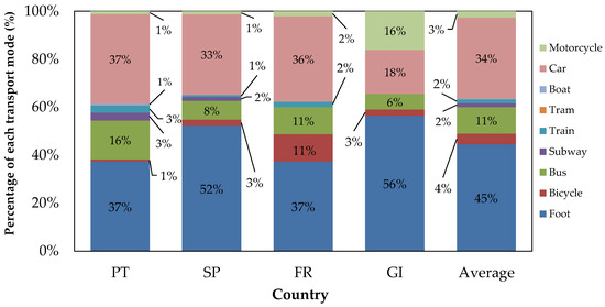 Walking was the second most-preferred transport mode (with the EU average being 42%). The Spanish population presented the highest percentage (59%), followed by France (45%), and then by Portugal (35%), which was below the EU average. These results are slightly different from the ones found in the present study, which was expected since our study focused on the scholar community. In our study, walking was the main transport mode for Spain (51%) and France (40%), followed by car (33% for both Spain and France). For Portugal, walking and car gathered both a percentage of 37%. Either way, the trend between countries found in the European survey for walking (Spain: 59% > France: 45% > Portugal: 35%) is similar to the one found in the present study (Spain: 51% > France: 40% > Portugal: 37%), despite the study populations being different.