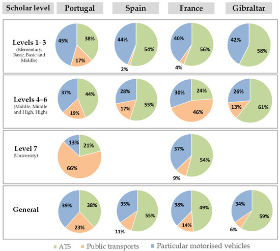 The present study allowed us to provide an assessment of the commuting patterns of the scholar community in 36 schools in the southwestern European region. The results of the present study were compared with the results for the population of three studied countries (Gibraltar was not included) and the general European population, which were found by the European survey [28]. This survey reached approximately 28,000 interviews at the EU level, and approximately 1000 interviews in SP, PT, and FR each. Interviewed citizens answered nine questions divided into three main groups: (1) daily mobility, (2) long-distance mobility, and (3) sustainability. It is important to highlight that our study focused on the scholar community, whereas the European survey target the general population.