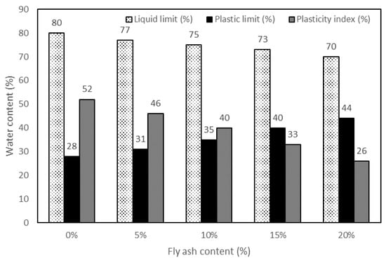 - LL decreases, PL increases, and PI decreases with increasing the fly ash content in the soil.