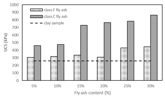 - UCS of soil increases with the addition of fly ash, however, class C fly ash is more effective in comparison with class F fly ash. An increase in curing time has a positive effect on the UCS of soil due to the time-dependent pozzolanic properties of fly ash.