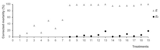 where E is the corrected mortality (%), Pt is the mortality of treatments (%), and P0 is the mortality of the controls (%).