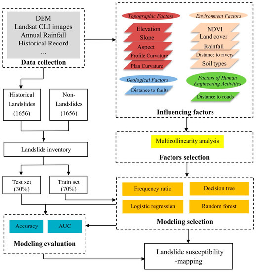 As shown in Figure 2, the entire workflow of this study has five main steps: (1) collect historical landslide points and build a landslide susceptibility evaluation index system according to the actual situation of the region; (2) The relationship between the selected factors and landslide is clarified, and the multicollinearity analysis of the selected factors is carried out; (3) Based on FR, LR, DT, and RF model, landslide susceptibility modeling is conducted using the 12 previously selected influencing factors; (4) The nnet, randomForest and rpart packages in R [31] were used to train and predict the model, and the landslide susceptibility map was drawn with the predicted results. (5) The performance of these models is evaluated and generates the dominant factors that trigger the occurrence of landslides.