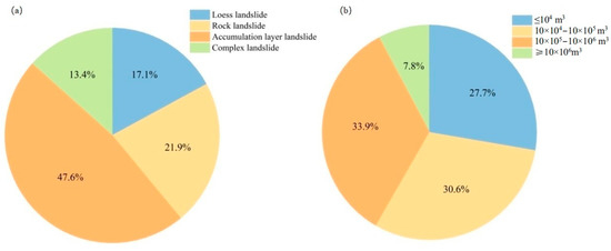In the study area, the landslide types mainly include accumulation layer landslide (47.6%), rock landslide (21.9%), complex landslide (13.4%), and loess landslide (17.0%) (Figure 4a). According to the volume of the landslide, the landslide is divided into small, medium, large and giant [29]. In addition, large landslides (10 × 105–10 × 106 m3) are the largest in the study area, accounting for 33.9% of the total. The second is the medium landslide (10 × 104–10 × 105 m3), accounting for 30.6% of the total. Giant landslides (≥10 × 106 m3) were the least significant, accounting for 7.9% of the total (Figure 4b).