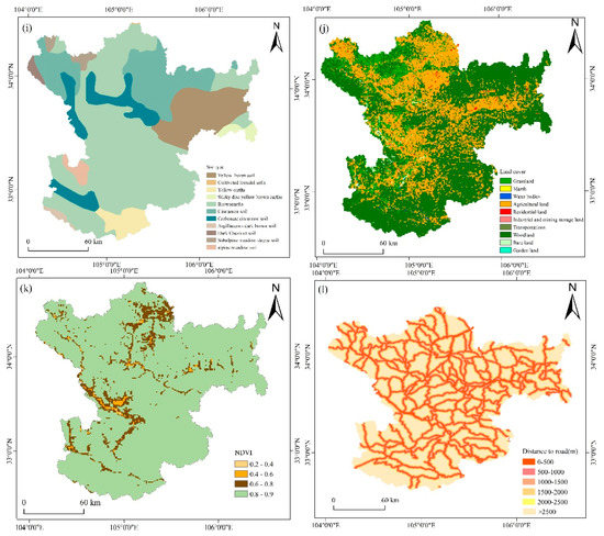 Soil type is also an important factor affecting the occurrence of landslides [42]. Different soil types have different characteristics. For example, loess has the characteristics of water sensitivity and impermeability, so it is easy for loess collapsibility to occur when it encounters water, resulting in a lot of landslides. In addition, vegetation varies under different soil types. Soil type was divided into eleven classes (Figure 5i).