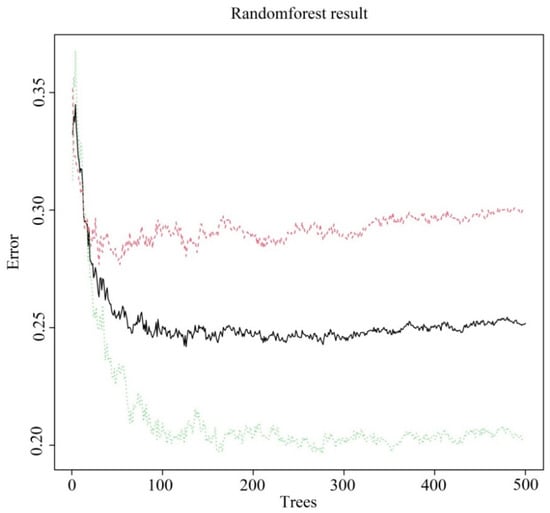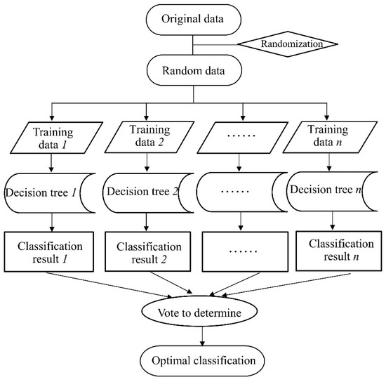 The RF is an ensemble learning method originally proposed by Breiman [50], which builds multiple decision trees through different data subsets and votes on the results of multiple decision trees to obtain the output of random forest. Numerous existing studies have shown that random forests have considerable tolerance for outliers and noise, are unlikely to over-fit, and have high prediction accuracy and stability [44]. When using RF model for classification prediction, n decision trees will be established, and each decision tree has one vote to select the optimal classification, and the final classification will be predicted by simple voting. The process of classification and prediction using RF model is as follows (Figure 6).