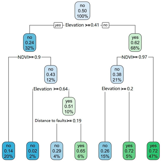 The DT model is a supervised non-parametric machine learning model that can be operated without prior knowledge of data distribution. It has the ability to easily interpret and model and handles the reduction of data complexity and relationships between variables. Compared with other models, the DT model is flexible, fast, and robust, and can be used to control the nonlinearity between input features and discrete classes, so that the nonlinear relationship between parameters does not affect the performance of the tree. In addition, the DT model is easy to construct and clarify, which makes it easy for decision-makers to use [48,49].