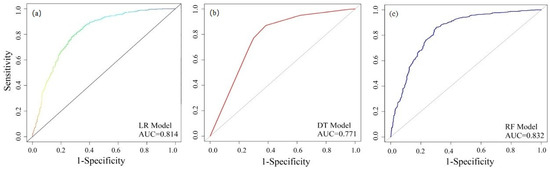 In order to evaluate the model performance, the accuracy values and the receiver operating characteristic (ROC) curves were used to test the accuracy of the three models. For the ROC curves, the horizontal axis of the ROC curve was the false positive rate (1-specificity), the vertical axis was the true positive rate (sensitivity), and the area under the line can be used as an index to evaluate the accuracy of a certain judgment method. The accuracy values of LR, DT, and RF models were 0.73, 0.74, and 0.76, respectively (Table 6). The AUC values of the LR, DT, and RF models were 0.81, 0.77, and 0.83, respectively (Table 6, Figure 13). Through analysis, the false negative rate of the LR, DT, and RF models was 0.23, 0.17, and 0.19, respectively. It manifested that the prediction power of the RF model was higher than that of the DT and LR models, which could be adequately applied to the evaluation of regional landslide susceptibility.