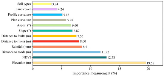 Furthermore, in order to obtain the influence of these factors on landslides, we used the RF algorithm to rank the importance of these factors. Regarding the results of the RF algorithm, the elevation (19.58%), NDVI (12.78%), distance to roads (11.72%), and rainfall (8.51%) factors had higher weight values than the other factors, indicating that the four factors were more vital for landslide occurrence (Figure 14). Firstly, this may be due to the typical mountainous terrain in Longnan City. High-altitude areas are mainly rocky cliffs, so the resistance to weathering is strong. However, low-altitude areas are prone to landslides due to the disturbance of many anthropogenic activities [44,55]. A strong relationship between NDVI and landslide has been reported in the literature [34]. First of all, the surface vegetation has a certain protective effect on the slope surface and inhibits rainfall infiltration to a certain extent, which is consistent with the research results of Wang et al. [56]. Secondly, most views believe that there is a certain correlation between vegetation and some stable old landslides. By analyzing the influence of road distance on landslides (Figure 14), we found that road distance was greatly correlated with the occurrence of landslides. Other recent studies have come to the same conclusion because of the increasing human urbanization process, which damages the natural environment and exacerbates geological hazards [39,44]. In addition, our results also indicate that rainfall is another major factor affecting the occurrence of landslides. This is mainly due to the fact that the mean annual precipitation in the study area is between 480–932 mm, mainly concentrated in June to September, and there are more heavy rains [37]. Alvioli et al.’s [57] study also pointed out that in recent years, the occurrence of sudden rainstorms caused by global warming has been frequent, leading to frequent landslides. It is critical to note that this is not the case in all regions, and the importance of factors affecting landslides can alter as local natural conditions differ from the intensity of human activity. Ngo et al. [11] reported that slope, land cover, distance to faults, and geology are the four most important factors affecting the occurrence of landslides.