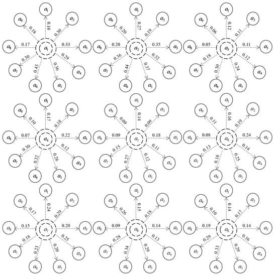First of all, eight experts were invited to provide their judgments on the existences and intensities of the influence relationships among nine barriers. The judgment results provided by the eight experts in the form of linguistic terms according to Table 2, i.e., eight initial direct-relation matrices, are shown in Table A9, Table A10, Table A11, Table A12, Table A13, Table A14, Table A15 and Table A16 of Appendix B. Then, matrices were transformed into by using Equations (6) and (7), and the results are shown in Appendix B. Furthermore, the group direct-relation matrix (as shown in Table 7) was constructed by combining direct-relation matrices based on Equations (8)–(12).