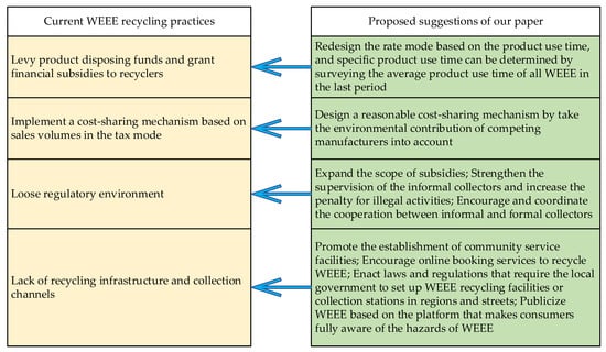 The government, as the administrator, has the decisive and significant role in the design of the top-level system for the development of the WEEE recycling industry. A stream of research in the closed-loop supply chain literature has analyzed several environmental policy instruments such as the recycling subsidies, deposit–refund models, and pre-disposal fees [11,31,32,33,34,35]. This stream of literature mainly focuses on the efficiency comparison of e-waste take-back policy implementations from perspectives of social welfare, environment, or/and consumer surplus, and concludes that different environmental policy instruments have advantages and disadvantages under different model settings and market conditions. Different from this stream of literature, we do not compare the economic and environmental performance of policies and regulations, but adopt the most prevailing and common reward–penalty mechanism to find the critical barriers which impact the sustainable development of WEEE recycling industry.