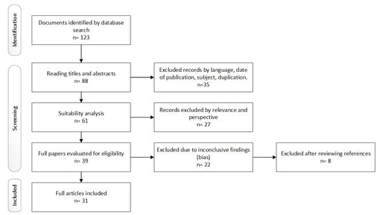 This section was divided into three phases: Identification, Screening, and Included. In the first phase, 123 articles were found. On the other hand, the first step of the second phase was to determine the eligibility criteria. See Table 2.