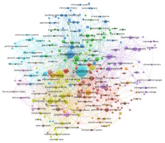 Finally, in the third phase, the 31 selected articles were reviewed again by two members of this research, who have several years of experience in the oil industry, 4.0 technologies, and literature reviews. In Figure 2, an analysis of the co-occurrence of all keywords in each document was performed using VOSviewer to understand which terms identify them and which are the most relevant in each article. The main words are represented by the terms pipelines, intelligent systems, and maintenance. This network was constructed with a minimum of two occurrences per keyword.