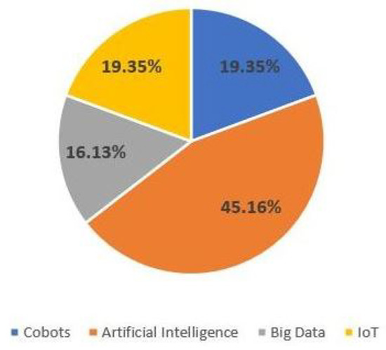 Figure 4 shows that, of the final sample of articles selected, 45.16% use AI, making it one of the critical technologies of the present and future of this industry. In second place is the use of collaborative robots or cobots and the IoT, whose use is advancing exponentially, representing 19.35% of the thirty-one articles. Finally, the use of big data occupies 16.13% of the total.