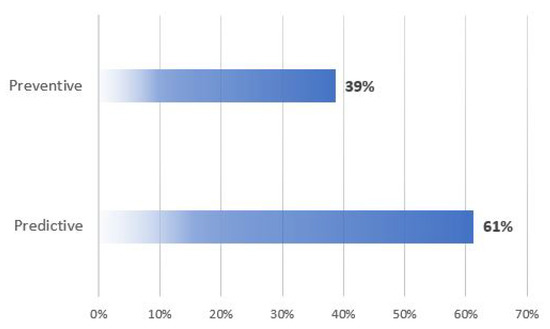 On the other hand, the selected articles were based on two points of reference: (i) Predictive maintenance and (ii) Preventive maintenance. Of the final sample selected (n = 31), 39% of the papers focus their methodology on preventive maintenance of oil facilities, specifically small and long-range pipelines. The rest of the documents developed systems that allow for predicting in advance the damage to some of their machinery and facilities, with critical thinking focused on the future, the optimization of economic and human resources, and the prevention of irreversible damage to the environment. This can be seen in Figure 5.