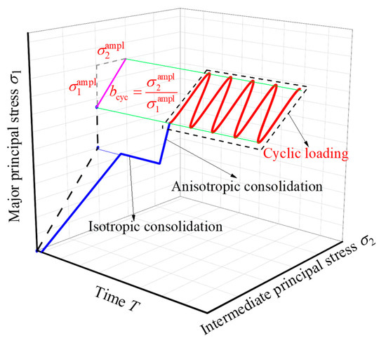 Figure 1 shows the consolidation and cyclic stress paths of the specimen in the cyclic true triaxial test. In a cyclic test, sine wave load with constant amplitude is applied, that is, only compressional stress without extensional stress, and there is no phase difference between the cyclic major and intermediate principal stresses. Different planar cyclic stress paths are applied by controlling the proportion of cyclic major principal stress Δσ1 and intermediate principal stress Δσ2. A parameter named the coefficient of cyclic intermediate principal stress bcyc is used to represent the interaction between Δσ1 and Δσ2, as follows: