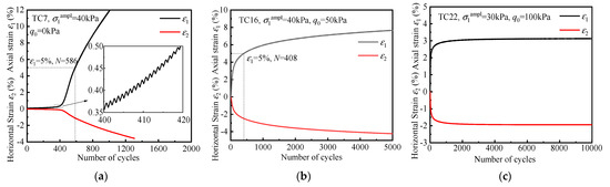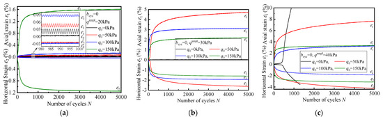 In order to analyze the effect of q0 on the deformation of specimen, Figure 3 depicts the variation of axial and horizontal strains with loading cycles under different q0 in the bcyc = 0 test. In general, the q0 has a significant effect on the deformation mode of the specimen, and with the increase in q0, the ultimate deformation mode of the specimen is elastic shakedown.