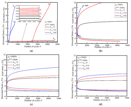 The interaction of these two cyclic principal stresses has a significant effect on the development of strains, and the effect is related to both qampl and q0. For the test of q0 = 0 kPa, as bcyc increases, the number of cycles in which it reaches critical failure increases, which means that its cyclic resistance decreases, as shown in Figure 4a. For the test of q0 = 50 kPa, the cyclic response for all tests is incremental failure, that is, the strain increases rapidly during the early stages of cycling, which is shown in Figure 4b. When bcyc = 0.8, because of the influence of the cyclic intermediate principal stress, a large axial strain is produced in the beginning cycles, resulting in a significant degradation of stiffness and the specimens reach failure in 400 cycles. For the test of q0 ˃ 50 kPa, the cyclic response of all specimens is elastic shakedown, and the values of strain components are obviously decreased, as shown in Figure 4c,d. In the case of bcyc = 0.8, at N = 5000, the axial strain when q0 = 100 kPa is approximately 1.5 times that of q0 = 150 kPa (7.1% vs. 4.6%). Furthermore, the existence of q0 would change the direction of horizontal strain. For example, in the test of bcyc = 0.4 and 0.8 in Figure 4a, the horizontal strain is positive, which is the opposite of the characteristics reflected in the other figure.