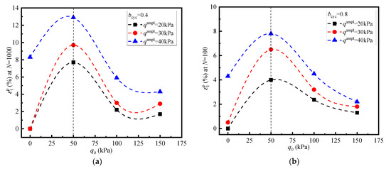 To show the effects of q0 on permanent deformation of specimen more clearly, the ε1p at N = 100 and 1000 under different q0 are replotted in Figure 5. It is clear that the ε1p is the largest in the q0 = 50 kPa tests, which corresponds to the bcyc = 0 tests. It can be concluded that the lower q0 could increase the deformation of the specimen while the higher q0 could reduce the deformation. In addition, Figure 5 shows that ε1p tends to increase with increasing qampl, whereas qampl has little influence on the trend of ε1p-q0 curves. This is inconsistent with the conclusions obtained in previous studies [15,16,17]. This indicates that saturated sand has different properties under true triaxial conditions.