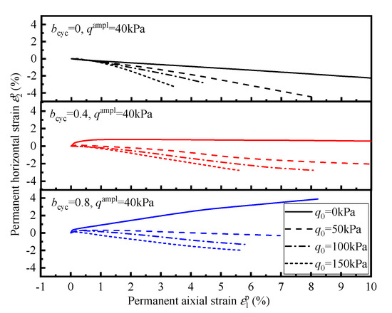 Figure 6 compares ε1p-ε2p curves under different level of q0. The slope of the ε1p-ε2p curves indicates the direction of its permanent strain path. The figure shows that the ε1p-ε2p curves have a similar trend under different q0, with the increase in q0, the length of ε1p-ε2p curves decreases and the direction of ε1p-ε2p curves rotates counterclockwise. For the test of bcyc = 0, all of the ε1p-ε2p curves are below horizon, which means that ε2p is always negative. For the test of bcyc = 0.4 and 0.8, the ε1p-ε2p curves are above the horizon line only at q0 = 0 kPa. Moreover, the slope of the ε1p-ε2p curves increases with the increase in bcyc, implying that the increase in bcyc leads to the increase in ε2p.