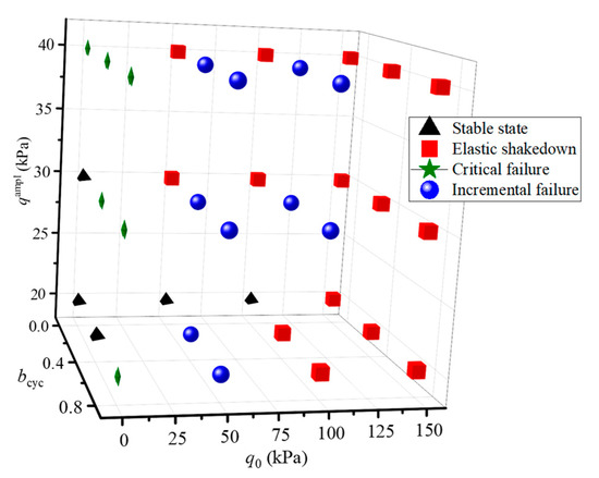 The above results show that the cyclic response of saturated aeolian sand depends on qampl, bcyc, and q0. Figure 7 summarizes the cyclic response of the tests under different stress conditions. In this figure, in addition to the three response modes for larger deformations, there is a stable mode with minimal permanent strain (<0.1%). It can be seen from the figure that the cyclic response of all specimens is elastic shakedown type at q0 = 150 kPa. Under the condition of q0 = 50 kPa, the cyclic response of specimens is mainly incremental failure. In particular, all the critical failures occur at q0 = 0 kPa.