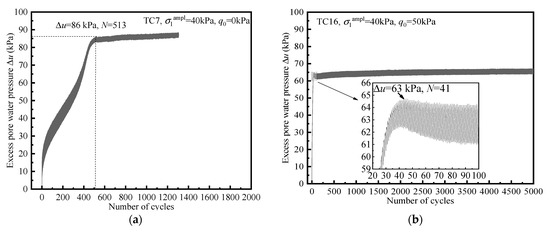 Typical developments of excess pore pressure Δu in undrained tests are presented in Figure 8. Figure 8a shows the development of Δu without initial shear stress, the cyclic response is critical failure, and the strain development is shown in Figure 2a. It can be seen that Δu rapidly accumulates during the beginning cycles, and Δu reaches the limiting value of 86 kPa at 513 cycles. This is the exact opposite of the characteristic of strain development shown in Figure 2a. Figure 8b shows the development of Δu in the existence of initial shear stress. As can be seen that Δu rises vertically at the beginning of loading and reaches 90% of the limit pore pressure in 20 cycles. Notably, Δu reaches the limiting value of 63 kPa at 41 cycles, whereas the strain begins to stabilize after 1000 cycles (Figure 2b).