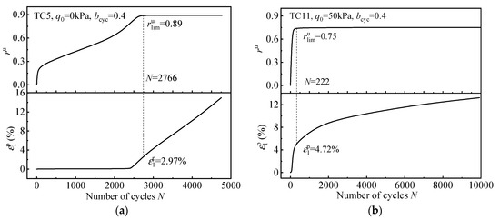 Figure 9 shows the relationship between residual pore pressure and permanent deformation under different stress conditions, where residual pore pressure ratio ru is defined as the ratio of residual pore pressure to initial effective confining pressure. Figure 9a presents the results without initial shear stress with bcyc = 0.4. As the number of cycles increases, ru and ε1p increase gradually. Furthermore, ru reaches the limiting value of rulim = 0.89 at N = 2766, with a permanent strain of approximately 2.67%. With the loading process, ru remains constant, while ε1p continues to increase until reaching 5% at 3099 cycles, that is, the strain-based failure criterion. Figure 9b shows the results with initial shear stress (q0 = 50 kPa), ru and ε1p increase sharply in the incipient cycles, and the rate of increase in ru is significantly faster than that in Figure 9a. The limiting value of rulim = 0.75 is approached at N = 222 with ε1p = 4.72%. In subsequent cycles, ru remains constant, while ε1p continues to increase moderately until the failure criterion is reached at 376 cycles.