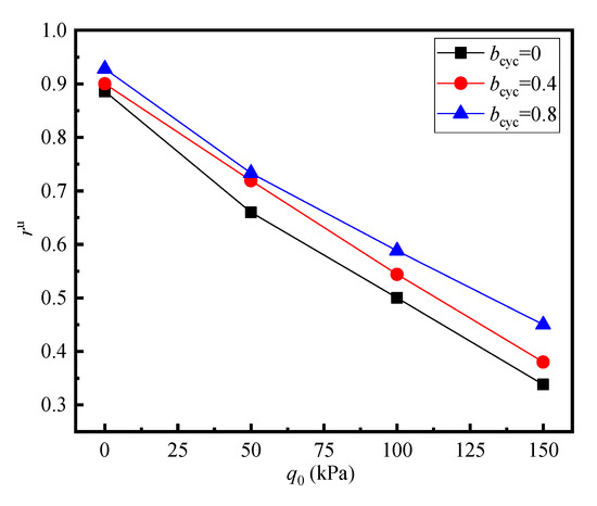 Obviously, the constant accumulation of permanent strain is associated with the development of residual pore pressure, and the limit value of residual pore pressure ratio depends on the initial shear stress. Figure 10 shows the relation between the limiting value of rulim and q0 at qampl = 40 kPa. It can be seen that rulim decreases linearly with the increase in q0 and reaches its maximum at q0 = 0 kPa, indicating that the residual pore water pressure of saturated aeolian sand under isotropic consolidation is closest to the initial effective confining pressure, as critical failure dominates. In addition, it can be seen that rulim increases with the increase in bcyc.