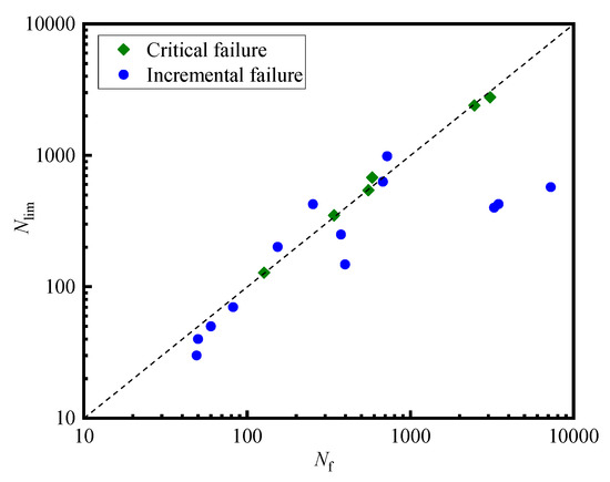 Figure 11 make a comparison between the required cycles for reaching limiting pore pressure (Nlim) and that for permanent axial strain reaching 5% (Nf). When the specimens show critical failure behavior, the test data all fall on the diagonal line of the image, which indicates that Nlim (pore pressure criterion) and Nf (strain criterion) are close. However, in the response to incremental failure, the Nlim is generally smaller than Nf, which is mainly because the axial permanent deformation continues to increase after the pore pressure reaches its limit. The scenario indicates that the pore pressure criterion can be used to estimate the failure of saturated aeolian sand in a safe way.