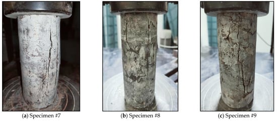 Three glauberite rock specimens, numbered specimen #7, #8 and #9 before the leaching test, were selected for the uniaxial compression test. The uniaxial failure mode of the three specimens was longitudinal splitting failure (Figure 17a–c). This is due to the circumferential stress generated by the samples of glauberite under the continuous axial compression load. The average uniaxial compressive strength of glauberite rock specimens in their natural state is 16.11 MPa, and the average elastic modulus is 5.824 GPa. According to China’s Code for Investigation of Geotechnical Engineering, it belongs to the soft rock category.