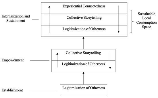 Analysis reveals an ascending dynamic that sustains and scales a local consumption space that is firmly rooted in community and a collective sense of place. This dynamic is largely the outcome of a CSBM that is intentionally facilitated by a master artisan baker turned community and cultural entrepreneur. Figure 2 represents the ascending dynamic as a value co-creation model that begins with the baker continually leveraging his reputation and the brand identity of his bakery to legitimize the otherness of his CSBM. This ongoing legitimization upholds and strengthens the foundation of a vibrant local consumption space and facilitates the scaling of its reach and impact. The next progression in the model layers in empowerment through the strategic curation and maintenance of a social media platform that is designed to vest customers in the value co-creation process. The final progression works to internalize a sense of community and belongingness within customers through the experiential connectedness that (re)occurs throughout in-person consumption routines. Such internalization sustains customer loyalties and participation in the value co-creation process. Note the elements build and recur in a synergistic manner, as indicated by the sets of bi-directional arrows within the empowerment and internalization and sustainment progression boxes in Figure 2. The continual recurrence of these elements works to sustain the Barrio Bread local consumption space and as will be discussed next, scale its community impacts.
