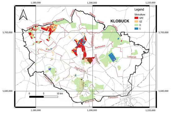 Forest management units in the Kłobuck Forest District. GPZ—selection/clear cutting; GZ—clear cutting; O—multifunctional protective forests, S—special (protected) forests.