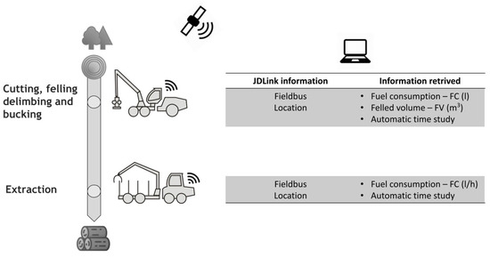 Since the involved machines are from the same manufacturer, to achieve the aim of the study, the official system of the company, called JDlinkTM (John Deere, Moline, IL, USA) was fully exploited. JDLinkTM is John Deere’s telematics system that connects all make/model machines produced by this company working in the field with the office and mobile devices. This is a wood procurement systems product, used for production, preparation and planning or feedback analysis of the data collected during production or for direct communication with the production so intended for desktop designated for this task (Figure 2).