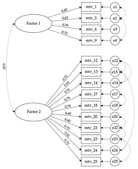 CFA with robust maximum likelihood estimation was conducted with the Satorra and Bentler [51] corrected chi-square (χ2 < 3) being applied, using AMOS 28.0 [52]. Comparative fit index (CFI), Tucker–Lewis index (TLI), and the root mean square error of approximation (RMSEA) were used to evaluate the overall global model fit. Higher values for CFI and TLI and lower values for RMSEA indicated a better fit. CFI and TLI ≥ 0.90 and RMSEA ≤ 0.08 were criteria for adequate model fit, whereas CFI and TLI ≥ 0.95 and RMSEA ≤ 0.06 were criteria for well-fitting models [53]. Browne and Cudeck [54] employed the definition of “close fit”, as PCLOSE gives a test of close fit (≥0.05). Standardized Root Mean Square (SRMR) allows the average magnitude of the discrepancies between observed and expected correlations as an absolute measure of (model) fit criterion to be assessed, and it should present < 0.08 value [55]. Several multiple regression analyses were carried out to assess the variables that contribute to explaining the motivations.