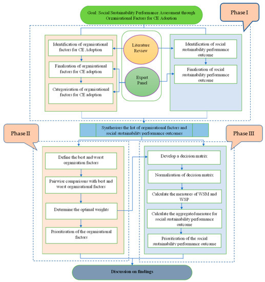 This study uses a three-phase solution methodology to analyse the organisational factors to adopt the CE practices and their impact on social sustainability. In order to accomplish this, the first phase starts with the identification of the organisational factors that are significant for CE practice adoption and the social sustainability performance outcome. These factors and social performance outcomes are identified through the literature review and finalised with a focused group discussion. The focused group discussion is performed with the help of an expert panel that has adequate experience and knowledge about CE practices and their impact on sustainability. This expert panel consists of eight members including academia and industry experts to capture a balanced view [70]. The academic experts are universities professors working in the fields of the CE and sustainable supply chain. The industrial experts were selected based on their managerial experience of at least eight years in respectable organisations. Appendix A provides details of the experts. After the definition of the expert group, three rounds of focus group discussion are conducted with three objectives: to finalise the organisational factor of CE practice adoption (Session 1); to categorise the organisational factors into appropriate dimensions as per their similarity (Session 2); to identify the social sustainability outcomes through the adoption of CE practices (Session 3). A sequential approach to focus group discussion is taken, such that the outcome of each session forms the basis for the next session and reaches a meaningful conclusion. In the second phase, the organisational factors are prioritised using the BWM. Several methods could be used for the ranking of organisational factors [11,71]. The BWM is considered suitable due to a smaller number of comparisons and consequently high expert time utilisation [11,72,73]. Further, the reliability of the BWM ranking is high [74]. Through the application of the BWM, the organisational factors are ranked in this phase. In the third phase, the social sustainability performance is ranked using the WASPAS method by considering the organisational factors as criteria. The proposed framework is provided in Figure 1.