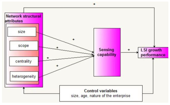 Sustainability has an obvious competitive advantage in LSSC, which can make LSSC adapt to and guide the market demand for a long time [6,7]. The purpose of LSI in forming a LSSC is to obtain scarce and complementary resources from the network and to improve the ability to adapt to environmental changes. These can guarantee their sustainable development in the long run in the global economy. Network structure attributes are variables that describe the topology of the social network [4,8] and reflect the overall network characteristics. They are used to reflect the essence of the network connection of LSSC. Social network theory holds that the network structure attributes, such as network size, network scope, network centrality and heterogeneity, among enterprises have a very important impact on the acquisition and utilization of enterprise resources, which in turn affects the growth of enterprises. Sensing capability is the ability to adapt to environmental changes. The existing research results show that the sensing capability can be influenced by enterprise network and can affect the growth performance of enterprises at the same time [9]. However, whether in practice or in theory, it is still inadequate for the study of the effect mechanism of the network structure on the growth of LSI. What is the role of sensing capability in the relationship between network structure and LSI growth performance? These questions have also led to a lack of clarity on how to leverage LSSC for LSI growth performance in a volatile market environment. This paper focuses on two key questions: