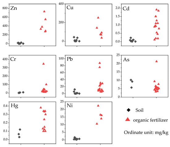 It has been shown that the content of heavy metals in feed was significantly and positively correlated with the content of heavy metals in livestock and poultry manure [15]. Therefore, the occurrence of heavy metals in livestock manure and organic fertilizer is inevitable. Cang et al. [16] investigated the heavy metals content of 48 samples of livestock and poultry manure and 2 samples of organic fertilizer from Jiangsu province of China, in which the livestock species included chicken, pig, cow, duck, goose and pigeon. It showed that the contents of heavy metals in chicken and pig manure were relatively highest, followed by goose and pigeon manure, and the cow and duck manure were relatively lowest. The highest contents of Zn and Cu in livestock manure were up to 77.42–505.9 mg/kg, 14.71–399.0 mg/kg, respectively. Organic fertilizer also had the highest contents of Zn and Cu at 203.37–377.16 mg/kg, 34.16–102.85 mg/kg, respectively [16]. The same pattern was found in 21 samples of organic manure and 133 samples of livestock manure from all over China by Liu Rongle et al. [17] as well, in which the highest content of Zn and Cu in organic manure was 275.8–615 mg/kg, 72.6–414.7 mg/kg, respectively. It is also worth noting that the contents of most heavy metals in manure followed the order: pig manure > chicken manure > Cow manure ≈ sheep manure. Dong Zhanyong et al. [18] examined 20 pig manure samples in Hangzhou China and found that the highest content of Cu and Zn in pig manure was about 300 mg/kg, followed by Cr and As around 6 mg/kg, and the contents of Cd, Pb and Ni were below 1.5 mg/kg.