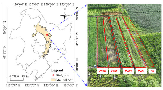 Location of the study area in the Mollisol region and aerial view of the experimental plots. Note: CK: abandoned land (Echinochloa crusgalli (L.) Beauv). PlotA: Zea mays L. PlotB: Sorghum bicolor × Sudanense. PLotC: Avena sativa L. PlotD: Lolium multiflorum Lam.