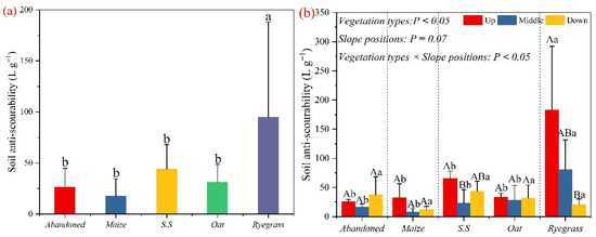 The soil ANS of different herbaceous plants (a) and different slope positions (b). Note: Abandoned: Echinochloa crusgalli (L.) Beauv. Maize: Zea mays L. S.S: Sorghum bicolor × Sudanense. Oat: Avena sativa L. Ryegrass: Lolium multiflorum Lam. Different lowercase letters indicate a significant difference among different herbaceous plants, and the different capital letters indicate differences among different slope positions at the p < 0.05 level, respectively.