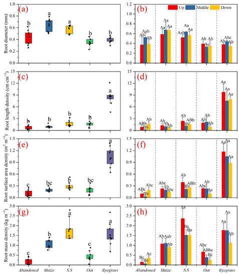 The root traits of different herbaceous plants (a,c,e,g) and different slope positions (b,d,f,h). Note: Abandoned: Echinochloa crusgalli (L.) Beauv. Maize: Zea mays L. S.S: Sorghum bicolor × Sudanense. Oat: Avena sativa L. Ryegrass: Lolium multiflorum Lam. Different lowercase letters indicate a significant difference among different herbaceous plants, and the different capital letters indicate differences among different slope positions at the p < 0.05 level, respectively.