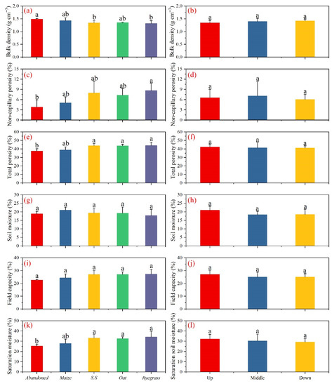 Soil properties varied significantly among the five herbaceous plants, while no differences were found between the three slope positions. The mean BD ranged from 1.32 to 1.49 g cm−3, and the maximum (Echinochloa crusgalli (L.) Beauv) was 12.76% higher than the minimum (Lolium multiflorum Lam.; Figure 4a). The soil NCP and TP ranged from 3.83% to 8.67% and 37.54% to 44.04%, respectively, and Lolium multiflorum Lam. showed the best soil pore structure, followed by Sorghum bicolor × Sudanense, Avena sativa L., Zea mays L. and Echinochloa crusgalli (L.) Beauv (Figure 4c,e). Meanwhile, high FC (27.30%) and SSM (34.21%) were measured in Lolium multiflorum Lam., which were 0.87%–20.81% and 3.41%–35.54% higher than others, respectively (Figure 4i,k). However, a low SM (17.86%) was found in Lolium multiflorum Lam., which was 15.00% lower than the maximum (Zea mays L.; Figure 4g). Furthermore, the soil porosity structure and soil moisture content generally increased with slope position from up to down, while BD showed the opposite trend (Figure 4).