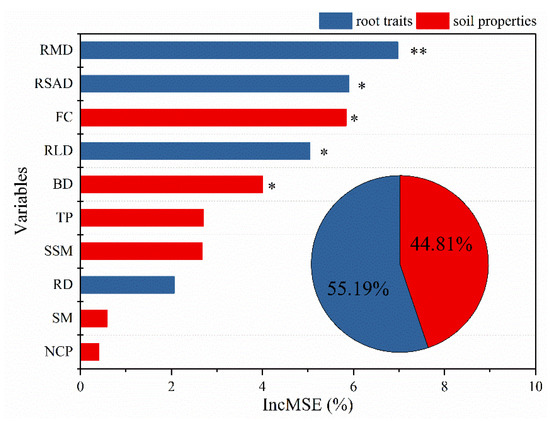 The relative importance of root traits and soil properties on soil ANS. Note: RMD: root mass density. RSAD: root surface area density. FC: field capacity. RLD: root length density. BD: soil bulk density. TP: total soil porosity. SSM: soil saturated moisture. RD: root diameter. SM: soil moisture content. NCP: noncapillary porosity. * represents the significance at the 0.05 level, ** represents the significance at the 0.01 level.