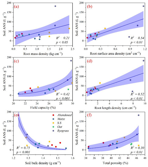The relationships between soil ANS and root mass density (a), root surface area density (b), field capacity (c), root length density (d), soil bulk density (e) and soil total porosity (f). Note: Abandoned: Echinochloa crusgalli (L.) Beauv. Maize: Zea mays L. S.S: Sorghum bicolor × Sudanense. Oat: Avena sativa L. Ryegrass: Lolium multiflorum Lam.