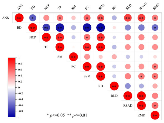 Correlation between soil ANS and root traits and soil properties. Note: RMD: root mass density. RSAD: root surface area density. FC: field capacity. RLD: root length density. BD: soil bulk density. TP: total soil porosity. SSM: soil saturated moisture. RD: root diameter. SM: soil moisture content. NCP: noncapillary porosity.