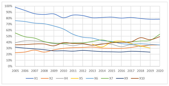Figure 1 shows values of the coefficients of variation for 8 indicators in the area of Sustainable Cities and Communities in the years 2005–2020, and Figure 2 presents their average values. Due to numerous data gaps, it was impossible to calculate the values for indicators X3 and X8. The greatest differentiation, remaining practically at the same level throughout the analyzed period, was observed in the case of X1: overcrowding rate by poverty status (%). Significant differences, even though showing a decreasing trend, were also observed in relation to indicator X6: recycling rate of municipal waste (%). The average value of the coefficient of variation in the years 2005–2020 for these indicators was at the level of 84.0% and 52.5%, respectively. The analyzed EU Member States were characterized by the smallest average differences in terms of X2: population living in households considering that they suffer from noise and X9: share of buses and trains in total passenger transport. However, in the case of the first indicator, the disparities showed an increasing tendency, whereas regarding the second one, there was a noticeable tendency towards a further decrease in the disproportions between individual countries.