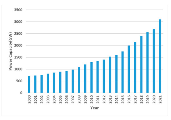 Renewable resources such as solar energy and wind energy are intermittent and unpredictably variable, due to sudden variations in solar radiation and wind velocity. Furthermore, these sources of energy are unable to adjust to increased demand, rendering the reliability of these systems difficult to maintain. They also necessitate a significant capital commitment, as compared to traditional sources [8]. HRESs, which typically incorporate RESs as the primary sources, with BAs and/or DGs as backup, have been used to conquer the varying nature of renewables. HRESs can ensure power accessibility when one of the generation sources encounters intermittency. These solutions may help to reduce expenses, optimize the size of system components, lower operation costs, and assure access to inexpensive and dependable, as well as sustainable, energy sources [9,10]. The global generation capacity of the HRES is shown in Figure 1 for the years 2000–2021. The development of new mechanisms to study the importance of the HRES is necessary [11,12].