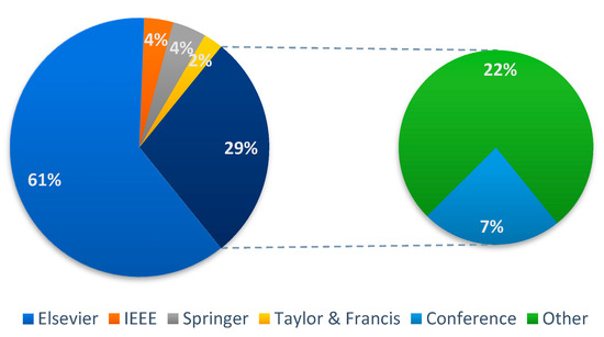 The number of papers, based on the publisher, in terms of percentage.