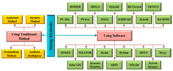 Kamal Anoune et al., utilized this program to model and simulate PV and thermodynamic hybrid systems. The findings demonstrated that the hybrid system was technologically viable and cost effective for a solar PV system [35]. Scientists utilize two fundamental methods, like commercial software and traditional methods. Recent articles quote these as the sizing methods of HRES. Comparison of the software and traditional methods revealed that commercial software is simple to use, versatile in simulation, and quick in optimizing results. However, the software method requires rigorous mathematical analysis in implementation. Traditional approaches can better optimize the sizing field than commercial software. Traditional approaches produce faster results and address MO problems, but they are complicated and limited in flexibility. Traditional sizing procedures are divided into four categories, as given in Figure 4.