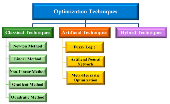 Optimization in HRESs plays a pivotal role in optimizing the functionality of HRESs. Figure 5 shows the three major types of optimization methods, namely, classical, artificial, and hybrid. In addition, the various types and sub-divisions of these optimization techniques are discussed in the following subsections.