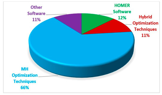 The overview of optimization techniques/software used in HES is given in the following subsections. Compared with other optimization techniques/software, the MH optimization technique is primarily used in HESs. The LCOE, NPC, COE and LPSP are the most commonly used objective functions for optimizing HESs. Along with these objective functions, other objectives, which are associated with MO optimization, are also taken into consideration by some authors, such as Annualized Capital Cost (ACC), Internal Rate of Return (IRR), Cost of System Lifespan (CSLS), Loss of Load Expectation (LOLE), Expected Energy Not Supplied (EENS) and so on. Objectives like Loss of Load Probability (LOLP), Annual Cost of Load Loss (ACLL), Forced Outage Rate (FOR), Return on Investment (ROI), Total Annualized Cost (TAC), and Total Life Cycle Cost (TLCC) are interesting to perform in HRESs for technological economic problems. Moreover, Renewable Fraction (RF), Human Development Index (HDI), and Job Creation (JC) MO objectives are factors determining which to employ in the proliferation of hybrid energy systems. MO objectives using objectives like Emission Curtailment (EMC), Operating Costs (OC), Net Present Value (NPV), Annualized Cost of the System (ACS), Total Energy Transfer (TET), Integral Square Error (ISE), Capital recovery factor (CRF), Salvage Value (SV), Total Net Annual Cost (TNAC), Potential Energy Waste Probability (PEWP), Initial Capital Cost (ICC), Energy Generation (EG), Gross Present Cost (GPC), Annual Energy Production (AEP), and Energy Cost (EC) [62] are really aimed at ensuring the HRES achieves practical implementation in unforeseen circumstances.