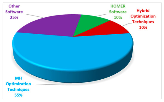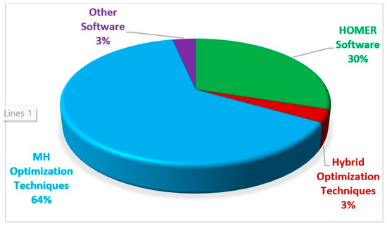 A study of several Energy Storage Systems (ESSs) and their abilities to improve dependability with the added stability of wind energy conversion systems was provided in [22]. A survey of current tools and methodologies for determining potential and usable energy in the most significant renewable areas was conducted. Usually, surveys aim to address issues of every renewable resource and tool that aid in analyzing the utilization of a mixture of various sources [23]. Configurations, criterion selection, sizing techniques, control, and energy management are among the key aspects to consider when developing a HES before its deployment [24,25]. A comprehensive review of these methodologies ensures HRESs offer more reliable and promising techniques. Jose et al. discussed some of the design, modeling, and optimization procedures regarding HRES, created in recent years, in [26]. The performance and reliability of HRES rely heavily on the elements of the system, such as a Wind Turbine (WT), a PV system, a BA storage system, a DG, and a local control center. Thus, the precise modeling of each element gives tools for better understanding the system’s performance and dependability. Judging from recent literature, the modeling of the elements is one of the most important tools for optimizing HRESs. Figure 3 shows the percentage of published papers pertaining to deployment of HRES in the recent past.